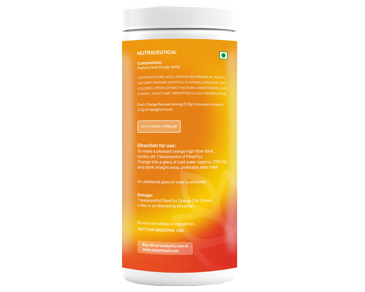 | Direction for Use | To make a pleasant orange high fiber drink, briskly stir one teaspoonful of FiberFizz Psyllium Effervescent into a glass of water (approx. 250 ml) and drink straight away, preferbly after meal. An additional glass of water is advisable. |