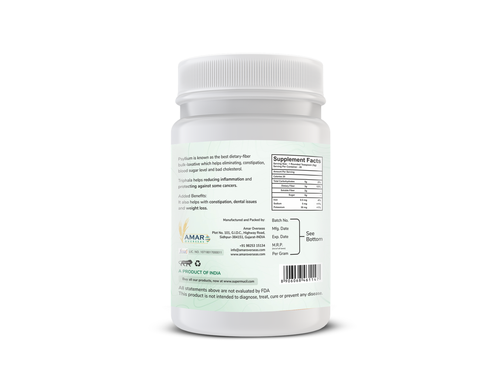 To make a pleasant high fiber digestive drink, briskly stir 1 teaspoonful of Supermucil Psyllium Husk with Triphala into a glass of cold water (approx. 250 ml) and drink straight away, preferably after meal. An additional glass of water is advisable.