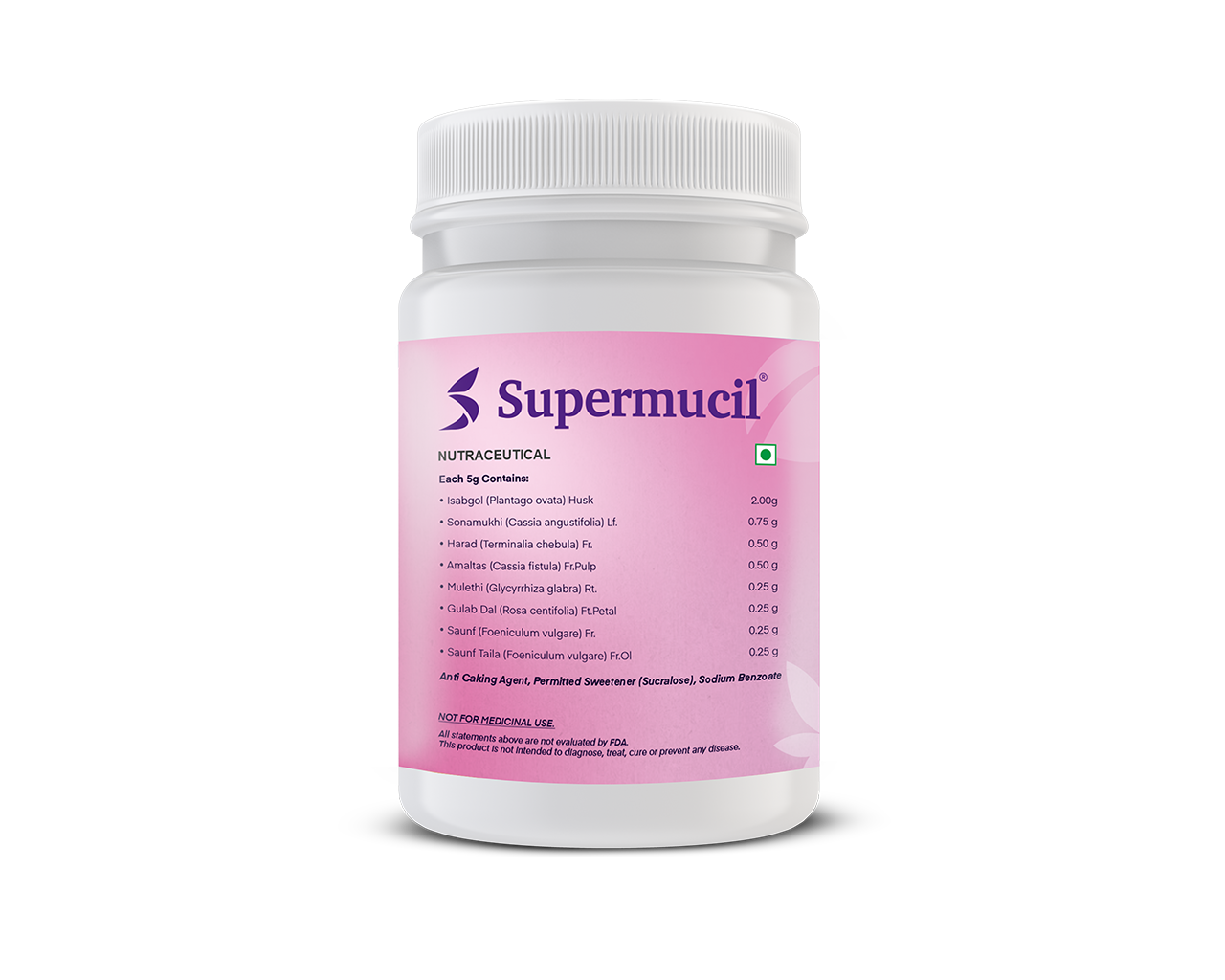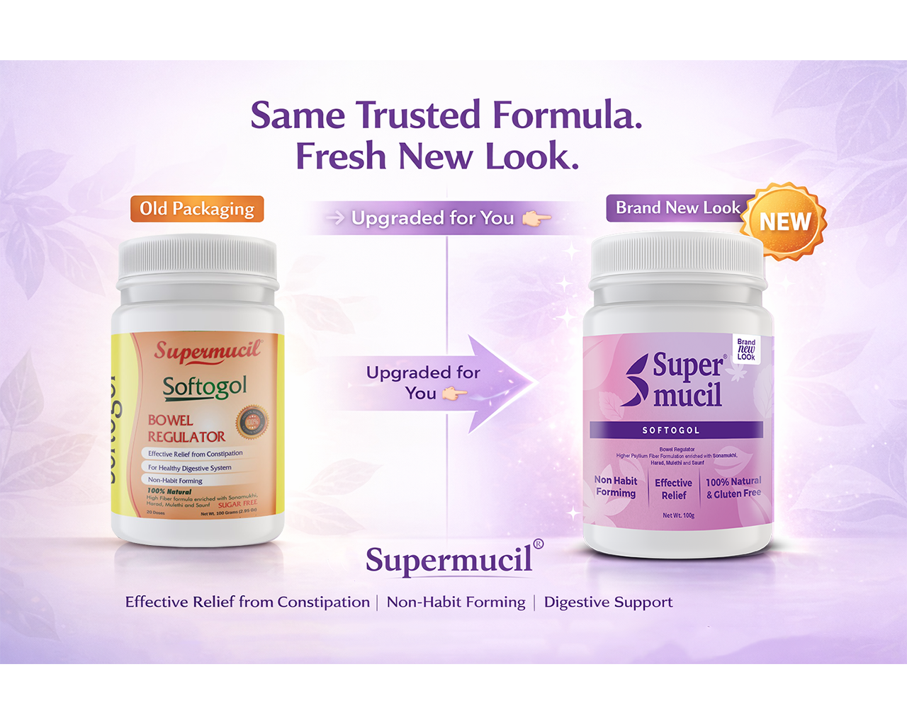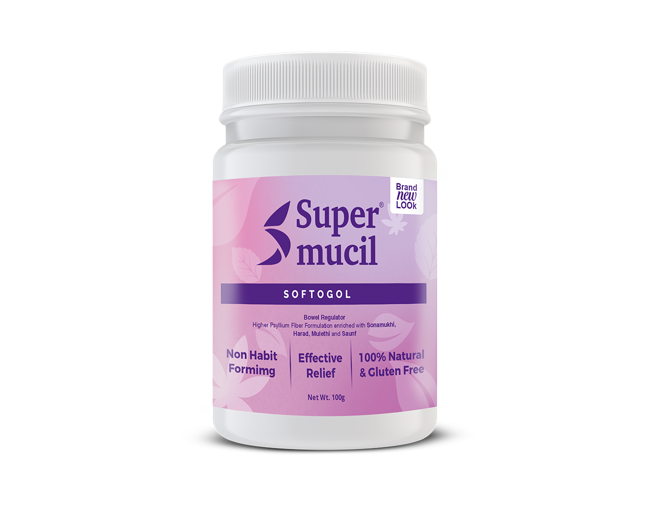 Supermucil Softogol 100g is a natural psyllium-based bowel regulator enriched with Ayurvedic herbs like Sonamukhi, Harad, Mulethi, and Saunf. It helps relieve constipation gently, supports smooth digestion, and promotes regular bowel movements—without forming dependency. A safe, effective, and gluten-free solution for daily digestive wellness.